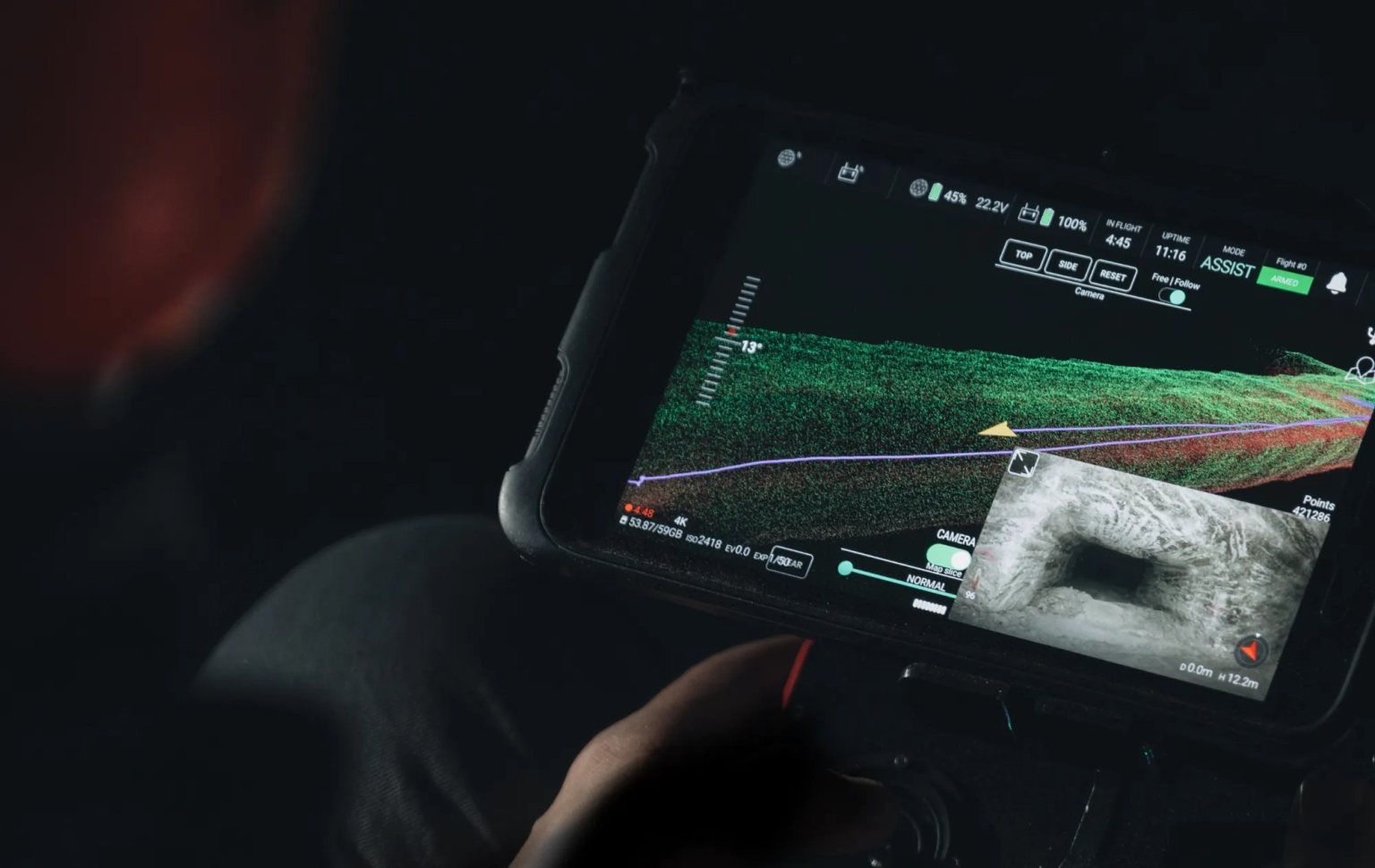 The on-board LiDAR constantly scans the surroundings to deliver a high-density point cloud map. This map is displayed in the Cockpit App in real time, giving you exceptional locational awareness. A real-time 3D view of the drone’s trajectory and environment provides crucial data. If visibility inside the environment is compromised (due to dust or moisture) you can continue to navigate your way safely.