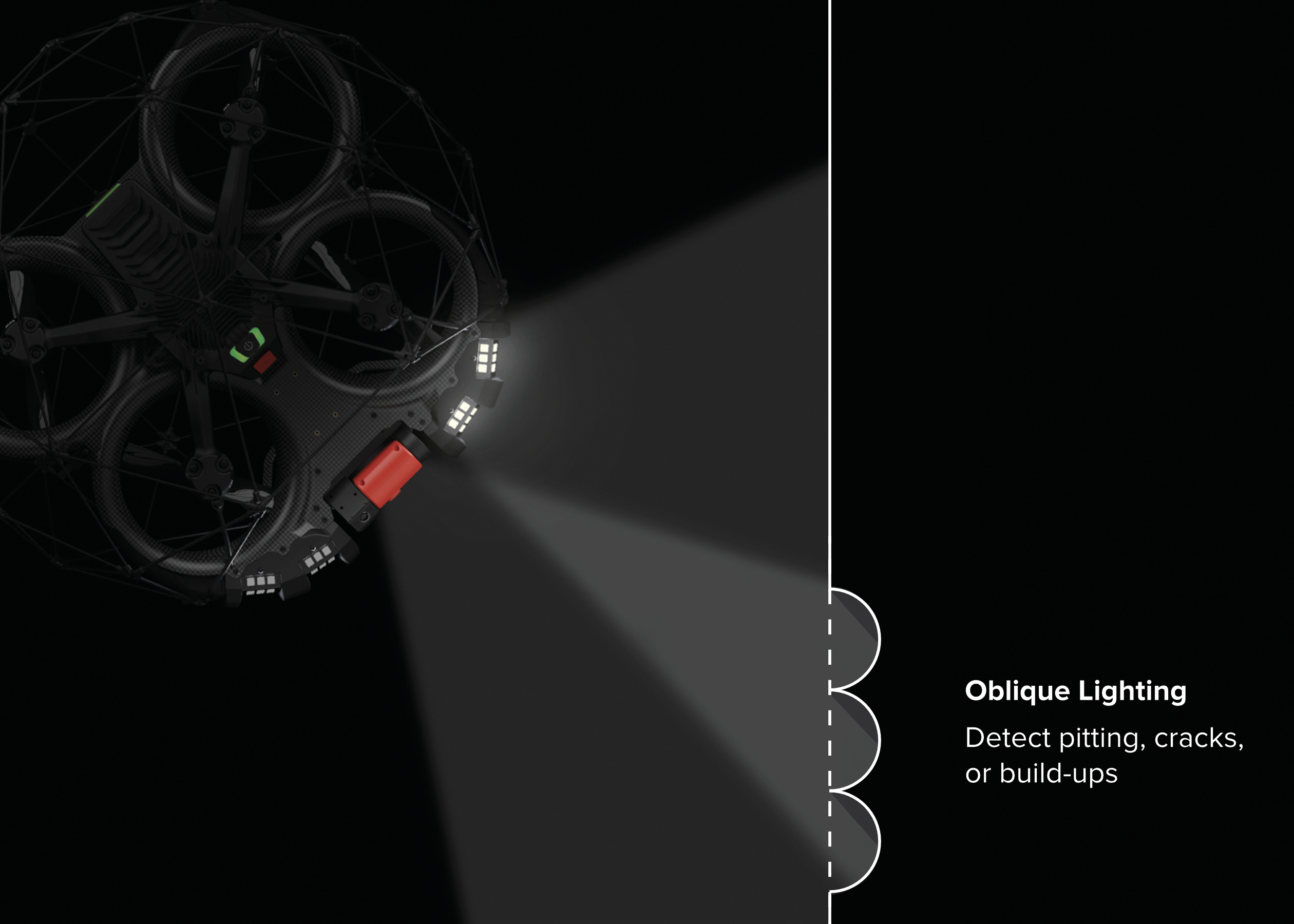 The lighting system uses industry-leading oblique and dust-proof lights, designed to spot pitting and cracks in surfaces.