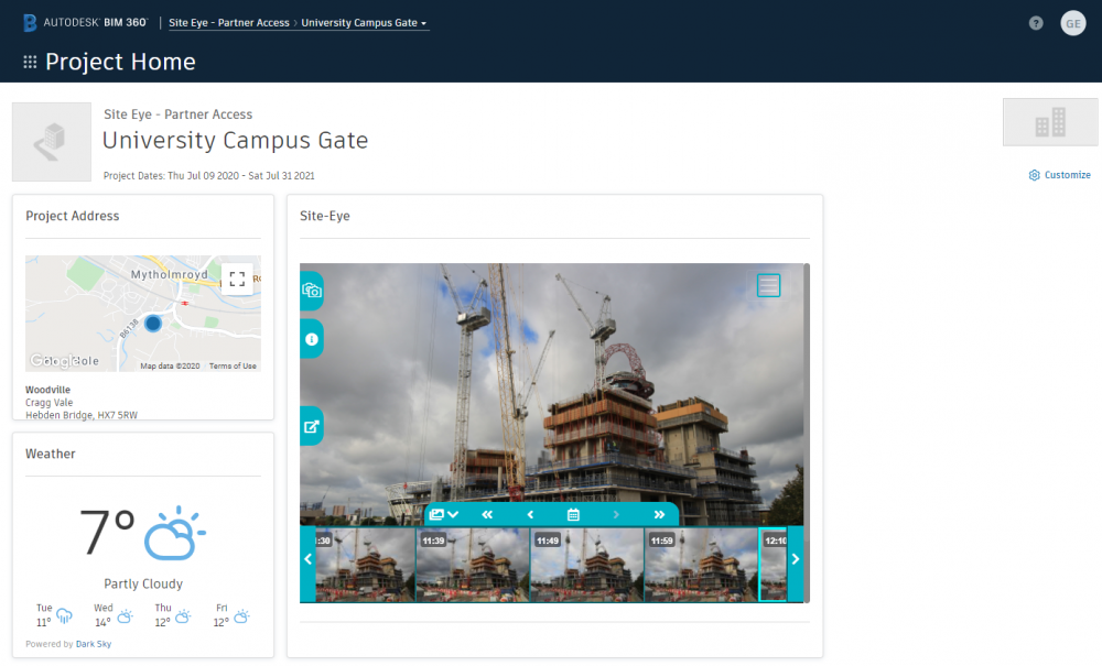 Site-Eye have partnered with Autodesk Construction Solutions to bring our high quality site monitoring and time-lapse imagery to the AutoDesk Construction Cloud. You can now embed a fully featured instance of the Site-Eye Project Portal directly onto your Cloud dashboard.