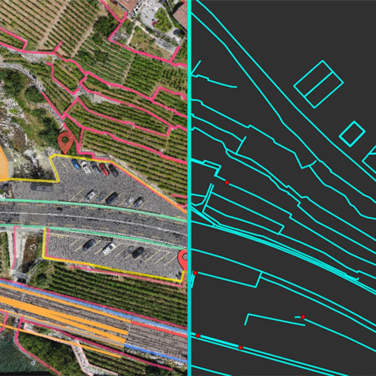 PIX4Dsurvey has built-in vectorisation tools: vectorize your project using points, polylines, polygons and catenary curves with just a few clicks.